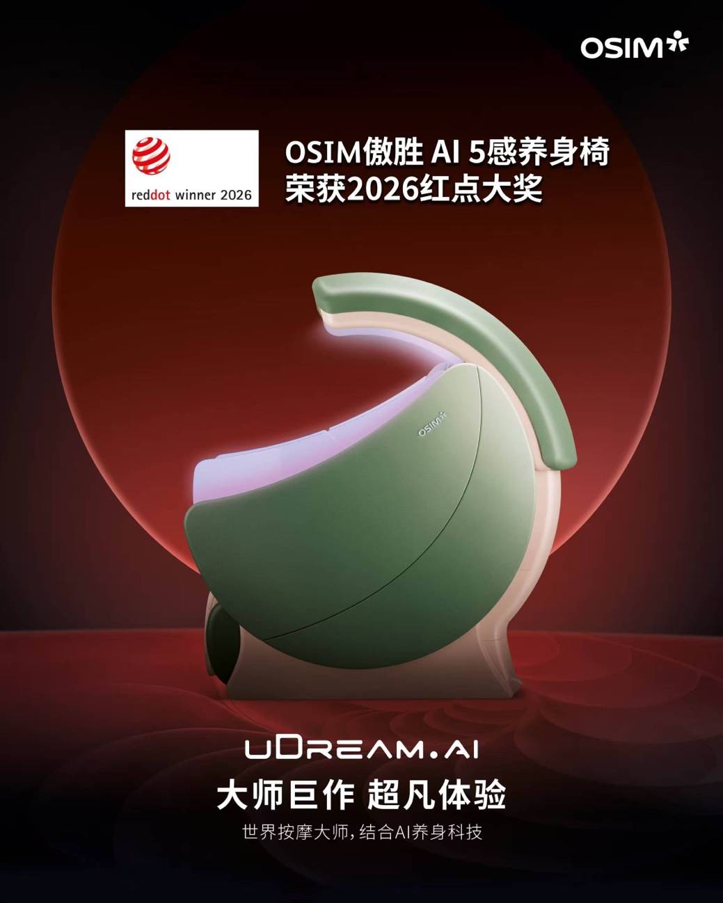 这款集成了人工智能、五感舒压技术、优雅美学的革新性产品,刚刚荣获全球工业设计领域最具权威的奖项之一——2026红点大奖。从“放松”到“懂你”,OSIM傲胜正以国际顶级设计水准与AI科技实力,重新定义高端养身的全新高度。